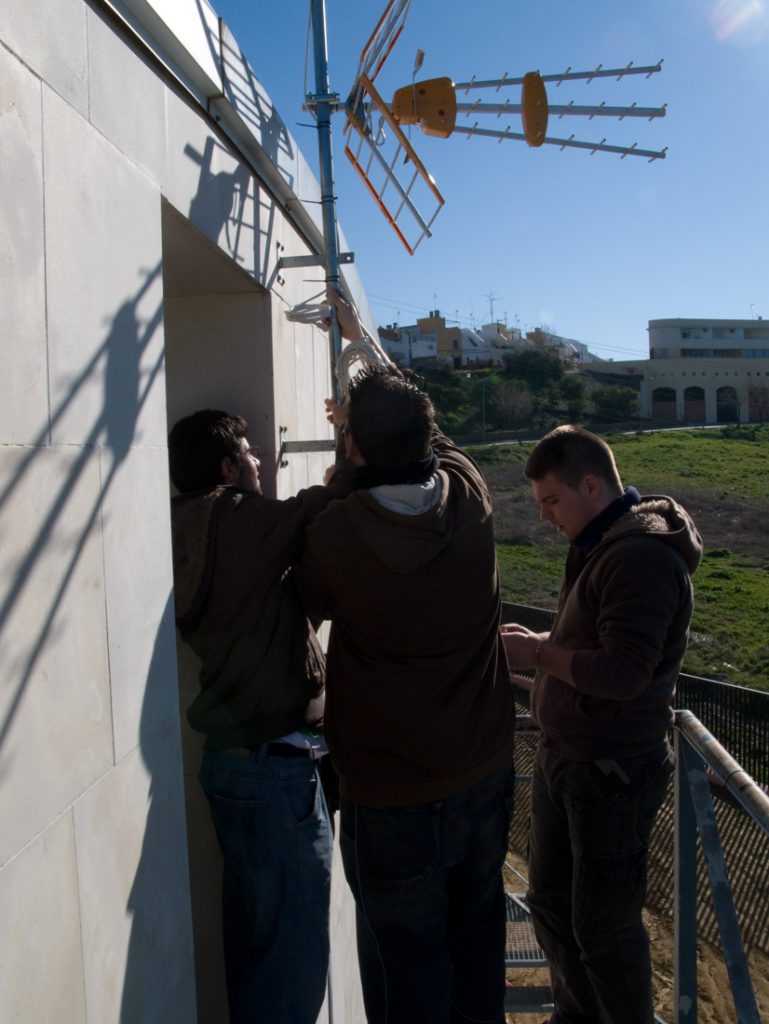 Y finalmente, años después, de 2007 a 2009, el ciclo formativo de grado medio de Equipos Electrónicos de Consumo, con Cárdenas. Tengo estas fotos que nos hizo Cárdenas el segundo año instalando una antena en el tejado del instituto. Éramos sólo 5 alumnos en 2º. Yo después hice prácticas de empresa en RTVMarchena.